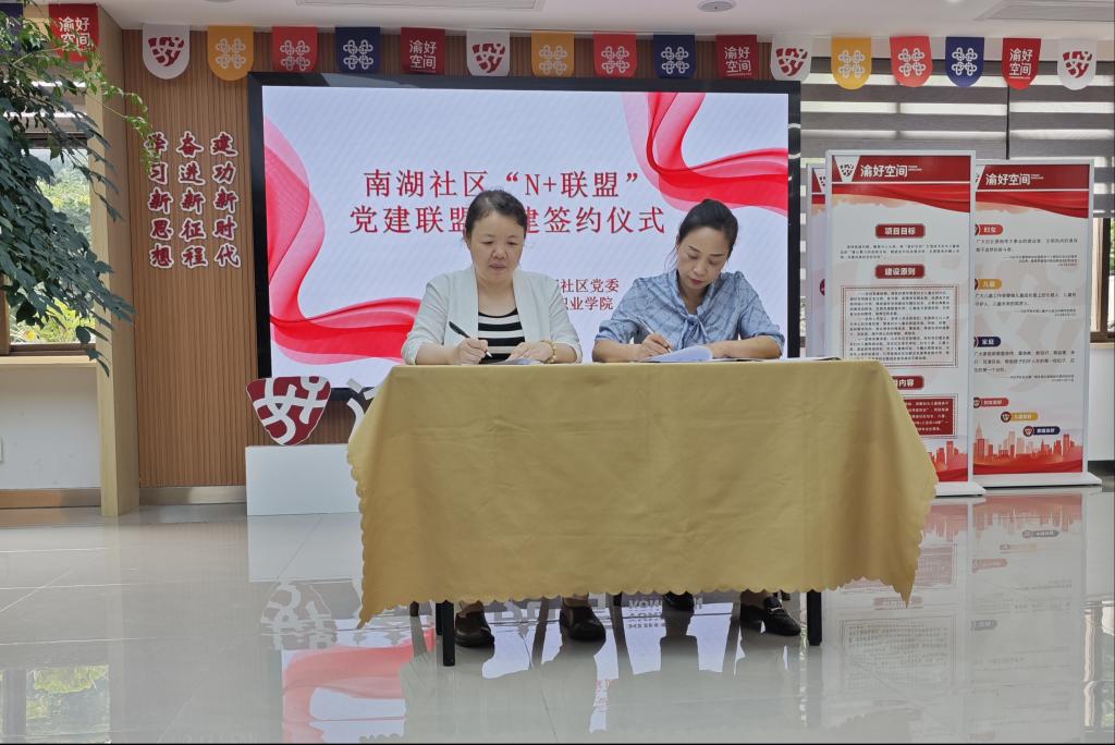6月28日下午,我校与重庆市南岸区花园路街道南湖社区在南湖社区党群服务中心举行“N+联盟”党建联盟联建签约仪式。南湖社区党委书记余建,学校经济管理与公共事务学院党总支书记刘兰英、副院长李静,学校继续教育学院院长林洁及教师代表参加了签约仪式。