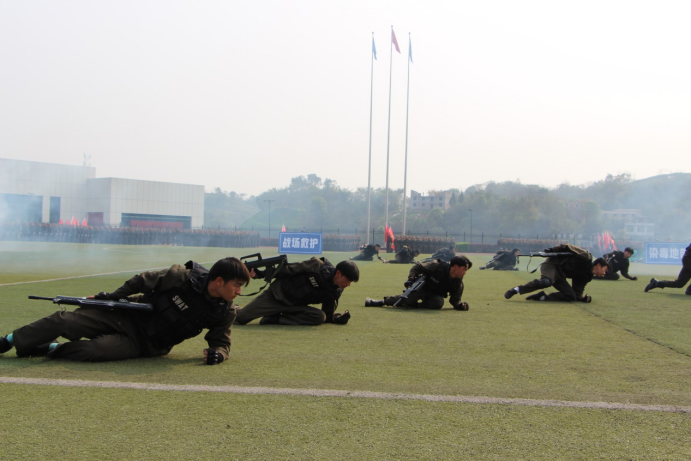 汇演的最后,是突击小队带来的军事演练表演。他们匍匐前进,穿越毒气,到达前线,消灭敌人,保卫群众,向我们展示了保家卫国的军人面貌。后勤部队快速上前,在掩护下救下伤员。向我们展示了军队各个职位的军人优秀的作战能力。