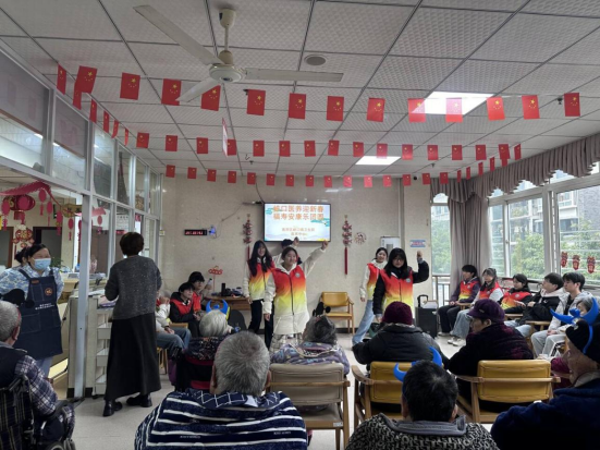 在峡口镇卫生院,志愿者们为老人们带来了一场充满节日气息与青春活力的文艺演出。节奏轻快的《你要跳舞吗》拉开序幕,动感旋律瞬间点燃现场气氛;志愿者扮成《熊出没》中的可爱卡通形象,伴着熟悉旋律跳起憨态可掬的舞蹈,引得老人们笑声连连、掌声不断;舞蹈《向前冲》以整齐昂扬的动作,展现青年一代的蓬勃朝气,更寄托了对新一年奋勇向前的美好祝愿。随后,《好运来》《拜新年》等喜庆歌曲相继唱响,欢快曲调与暖心歌词将元旦氛围拉满,不少老人跟着节奏轻拍手,眼中洋溢着喜悦与温暖。卫生院陈主任感慨:“同学们用青春活力感染了每一位老人,这份特殊的‘新年礼物’满含真情,让这个元旦格外温馨。”