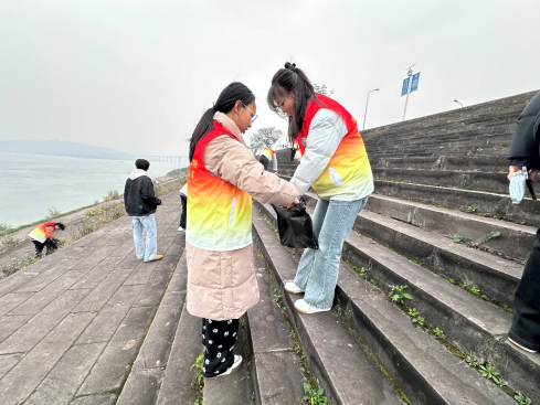 温暖传递不止于院内。演出结束后,志愿者们立即奔赴附近滨河步道。尽管天空飘着小雨,大家依然迅速投入“河小青”净滩行动:手持环保袋沿河岸细致清理烟头、包装纸、枯枝等杂物,对卫生死角进行重点整治。经过辛勤劳动,河岸环境焕然一新。活动尾声,志愿者们将捡拾的垃圾集中分类处理,并在清理后的河岸合影留念,用行动定格新年志愿风采。