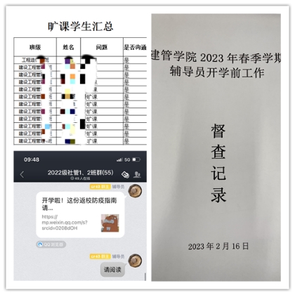 天气渐暖、万物复苏,新学期即将开始,为了确保建管学院学生顺利开学,2月16日下午,建设管理学院党总支副书记何浪在学工办副主任王玲的陪同下,到学院各辅导员办公室进行了2023年春季开学专项督导检查。