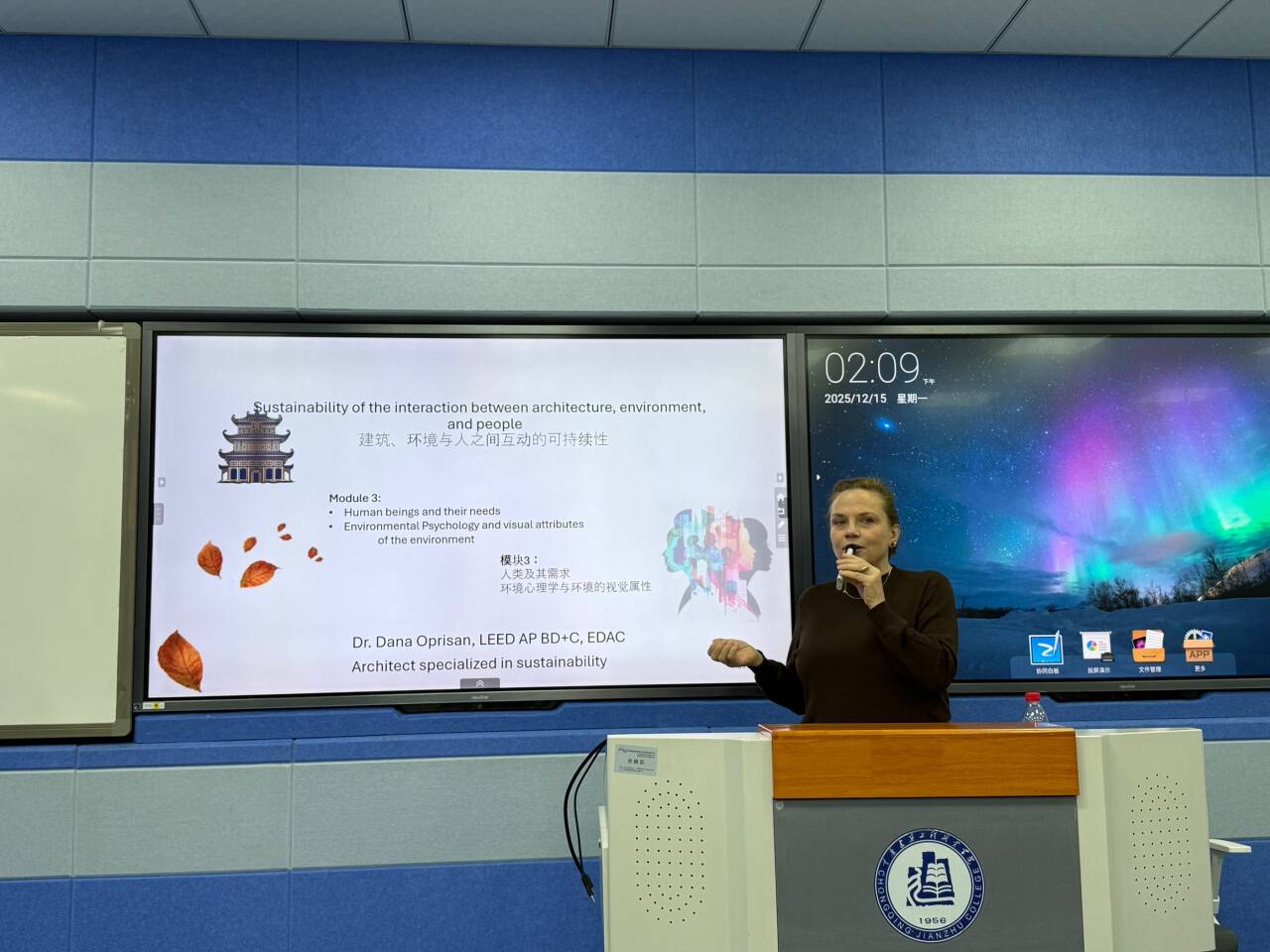 本次培训特邀法国EPF工程师学院绿色可持续建筑与工程专业副教授Dana Oprisan博士主讲。上午,Dana博士立足可持续发展全局视角,系统阐释了建筑与自然环境的共生关系,深入剖析了建筑在推动社会可持续发展进程中的核心价值,并提出“融合性创新”设计理念,倡导在尊重建筑传统的基础上,有机融合现代科技与前沿设计手法,赋予建筑作品全新生命力。她特别强调,建筑绝非单纯的技术与功能载体,更是承载人类行为模式、情感诉求与文化底蕴的重要空间形态。