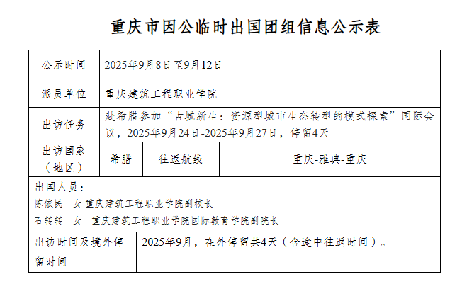 按照市委、市政府关于因公出国实行信息公开、建立出国团组信息公示制度等相关要求,根据已报市外事工作领导小组批准的2025年度教学科研人员因公临时出国开展学术交流合作团组出访计划,现将拟组团赴希腊参加“古城新生:资源型城市生态转型的模式探索”国际会议的相关信息予以公示(详见因公临时出国信息公示表)。