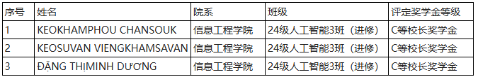 根据《重庆建筑工程职业学院外国留学生校长奖助学金管理办法(试行)》(建工职院〔2023〕139号),经学生申请和二级学院认定(评审)工作小组审议,学校“外国留学生校长奖助学金”评审工作小组评定,KEOKHAMPHOU CHANSOUK 等3名同学均符合校长奖学金资格。现将校长奖学金获评名单进行公示,公示时间为2025年3月20日至3月22日。如对评审结果有异议,请于2025年3月22日前以书面形式反映。