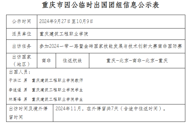 按照市委、市政府关于因公出国实行信息公开、建立出国团组信息公示制度等相关要求,根据已报市外事工作领导小组批准的2024年度教学科研人员因公临时出国开展学术交流合作团组出访计划,现将拟组团赴南非约翰内斯堡参加“2024一带一路暨金砖国家技能发展与技术创新大赛南非国际赛”的相关信息予以公示(详见因公临时出国信息公示表)。