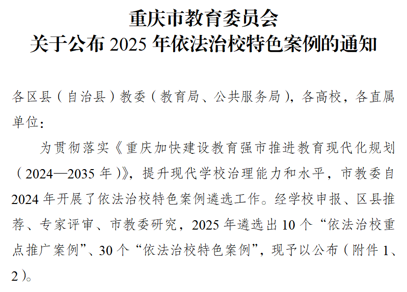 近日,重庆市教委公布了2025年依法治校特色案例名单,学校申报的“管住‘小微权力’推进现代学校治理”案例成功入选。
