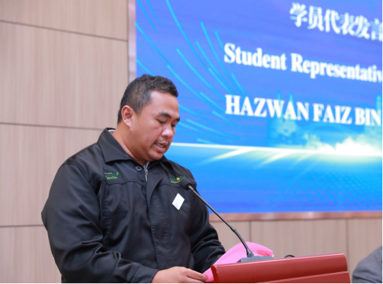 学员代表HAZWAN FAIZ BIN HARUN表示很荣幸能够参加此次研修,并代表全体学员真诚感谢重庆市政府给予的宝贵学习机会,郑重承诺将全身心投入研修学习中,当好友谊和合作的使者,为服务“一带一路”建设贡献力量。