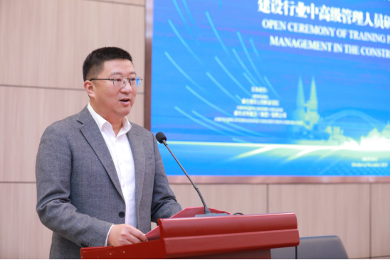 作为主办单位之一的重庆对外经贸(集团)有限公司总经理刘汉杰先生讲话,向支持举办本次项目的各单位表示衷心感谢,并对参与研修的全体学员表示热烈欢迎。他表示,本次研修项目,立足建设行业中高级管理人才需求,采取“订单式”开发教学资源和制定培训计划,为外建集团培养工程项目亟需的建设类中高级管理人才,解决了企业属地化经营战略中最关键的人才需求。真诚期望学员们积极研修、学有所成,成为外建集团各海外分公司的管理能手和中坚力量。