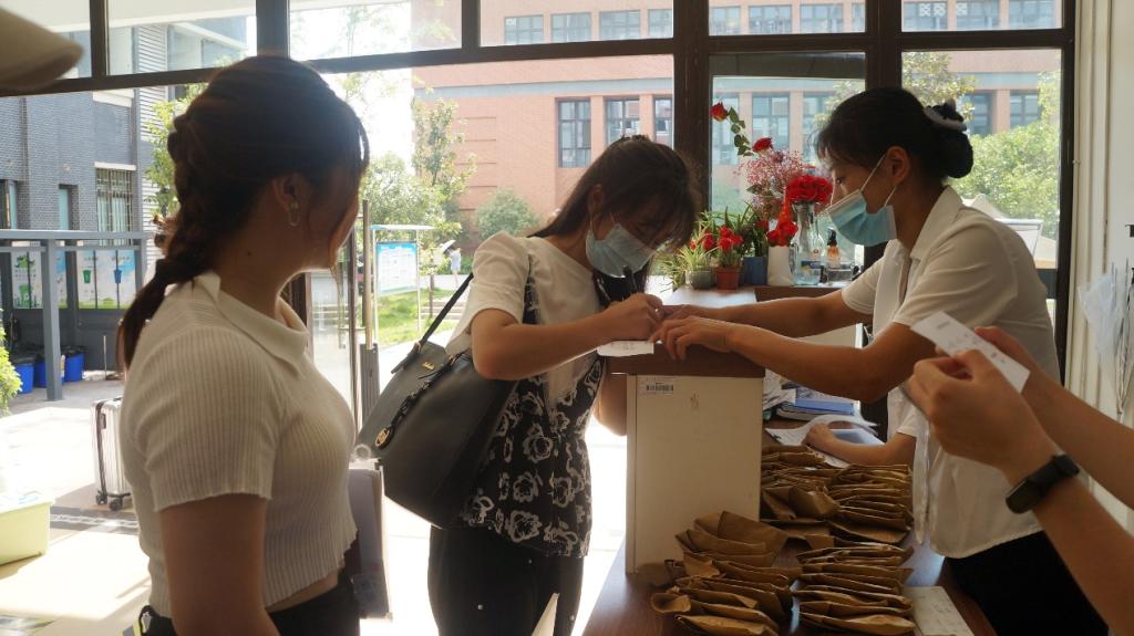 办理完注册登记后,新同学来到寝室楼一楼大厅办理入住登记,领取钥匙入住寝室。