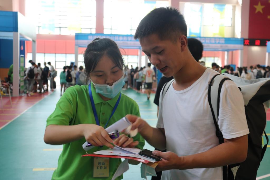学生活动中心内,各二级学院报到点依次排开,新生按照报到流程,进行电子注册、到辅导员处办理注册、核实身份、安排宿舍、领取一卡通、水卡等事项。