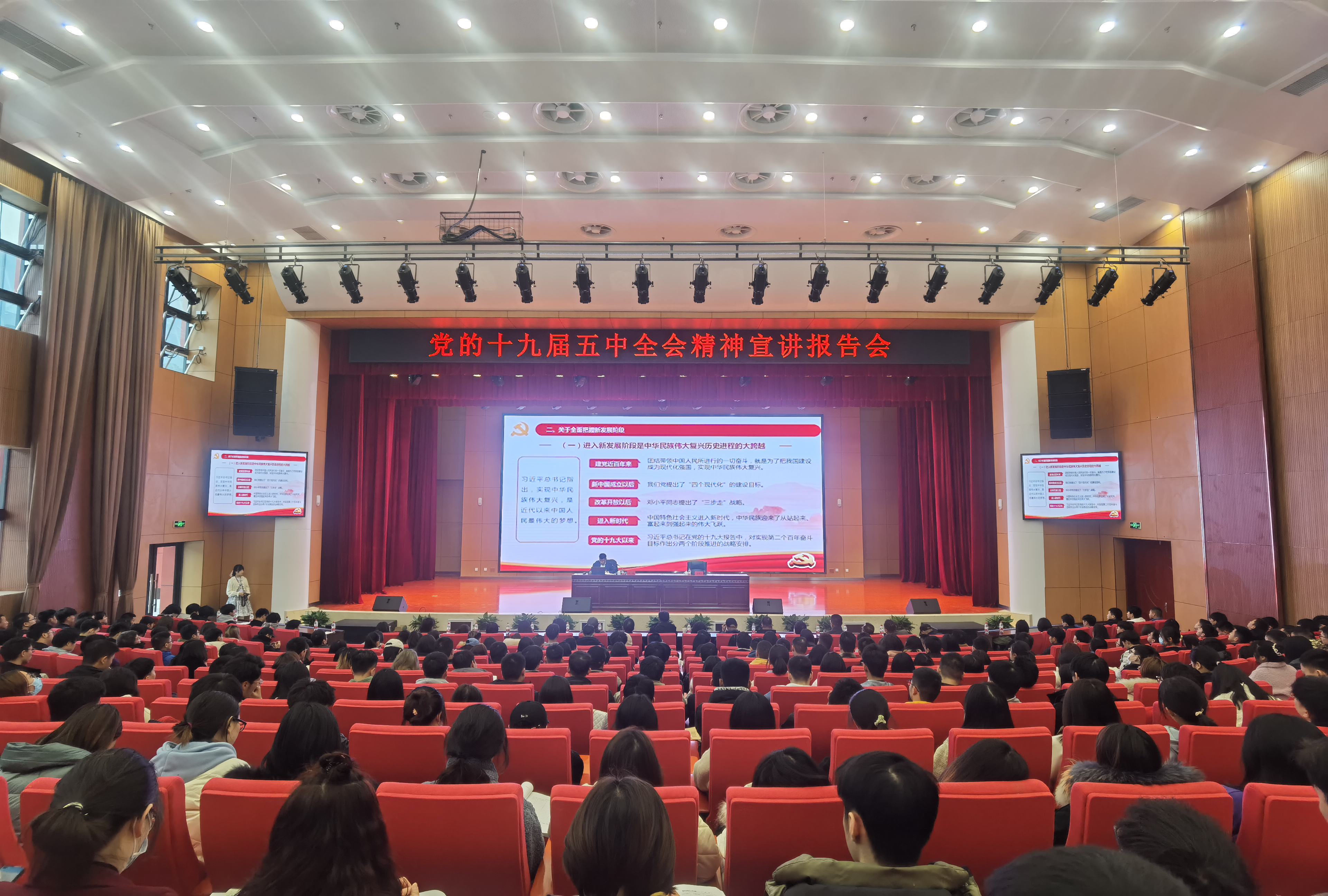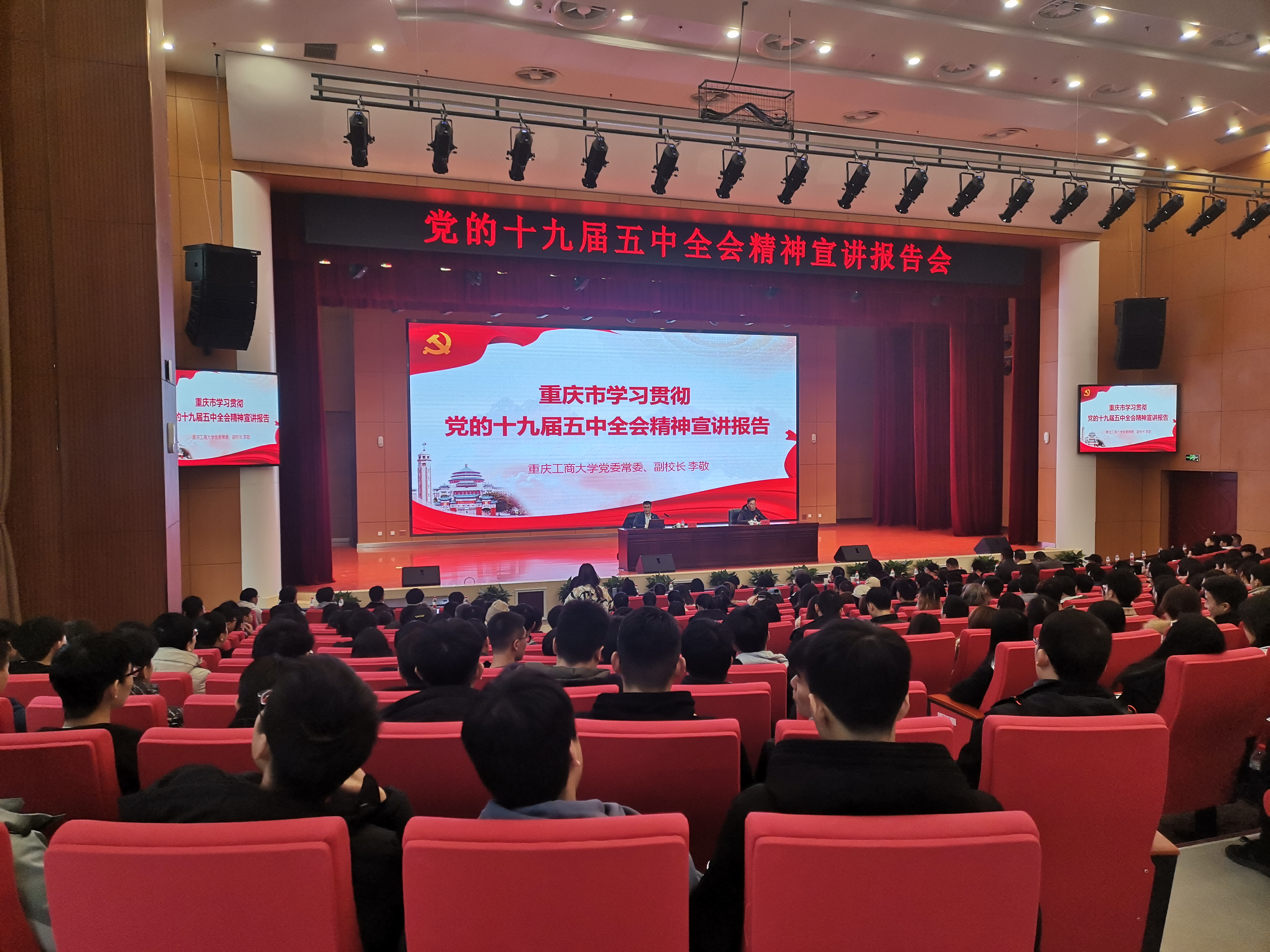 12月11日下午,根据重庆市委宣传部的统一部署,学习贯彻党的十九届五中全会精神市委宣讲团报告会在我院学生活动中心学术报告厅举行。市委宣讲团成员、重庆工商大学党委常委、副校长李敬教授围绕十九大报告作了全面系统的讲解和阐述。学院在校院领导、中干、辅导员和各系部学生代表约400人一同聆听了报告。党委书记邹晓波主持报告会。