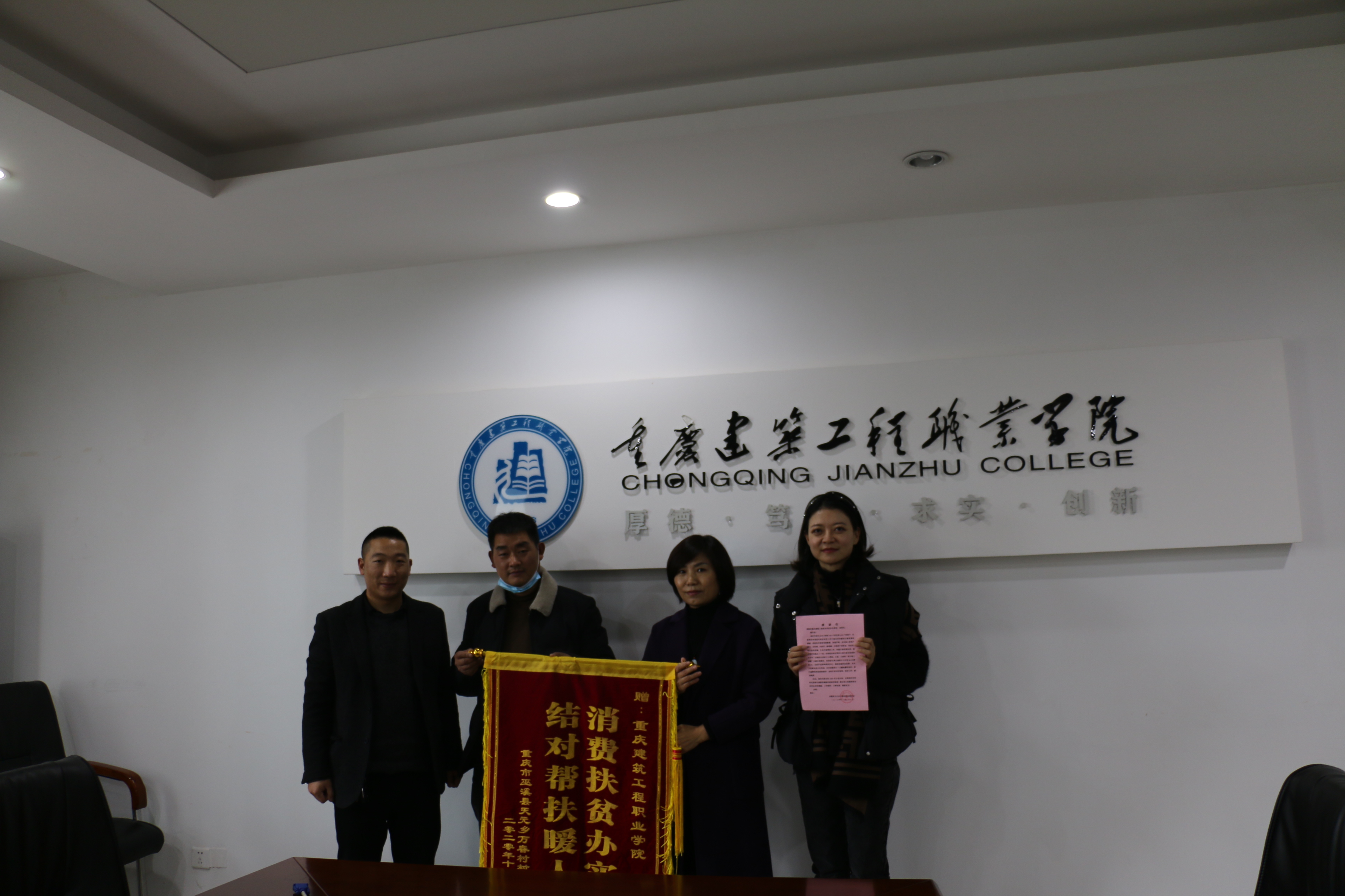 12月1日下午,巫溪县天元乡万春村村委会主任李俊、合作社法人陈棕森带着村民们的谢意,将一面锦旗送到学院,锦旗上写着“消费扶贫办实事、结队帮扶暖人心”,凝聚着全村村民的感激之情。学院党委副书记龚群英热情接待了两名同志并代表学院接受锦旗,随后进行座谈交流。