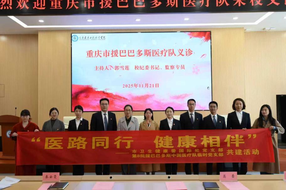 2025年11月21日,重庆市援巴巴多斯国家医疗队走进学校思政厅,开展医疗科普讲座与义诊咨询活动。市卫生健康委国际处处长杨彬、医疗队队长崔坤一行12人莅临现场,带来了精彩的科普报告。活动由校工会与团委联合组织,80余名教职工及学生到场聆听。学校纪委书记、监察专员郭雪莲主持本次活动。