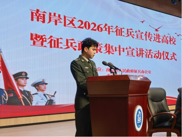 退役复学学生代表胡燃分享了军旅生涯的淬炼与感悟,用亲身经历讲述军营如何磨砺意志、增长才干,生动诠释了“退伍不褪色”的责任担当,让在场学子深受触动。南岸区人民武装部领导动员讲话中强调,要深刻认识新时代国防建设的重要意义和青年肩负的使命责任,并对2026年征兵工作提出明确要求,激励广大青年学子以昂扬姿态投身强军实践。