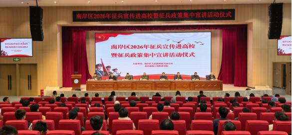 12月10日上午,南岸区2026年征兵宣传进高校活动启动仪式在学校东站校区图书馆报告厅举行。南岸区人民武装部领导、学校党委书记吴国雄和重庆交通大学、重庆邮电大学、重庆工商大学、重庆第二师范学院等高校相关部门负责人,以及400余名师生代表齐聚现场,共同吹响青年学子携笔从戎、报效祖国的新时代号角。启动仪式由党委保卫部部长郭高主持。