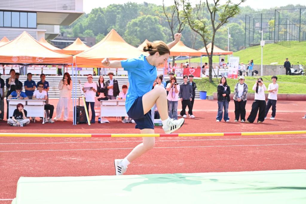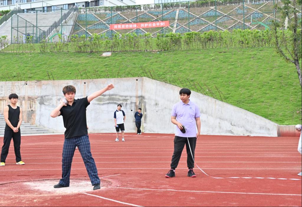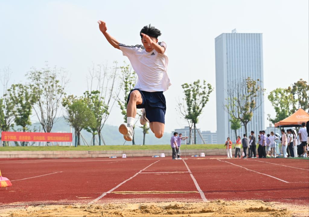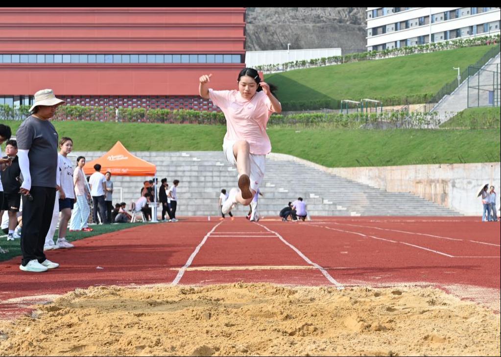 跳高、跳远、三级跳远场地中,助跑、起跳、腾空一气呵成,同学们轻盈腾跃,似飞鸟凌空,在空中划出一道道舒展而有力的优美弧线,落地瞬间扬起的细沙,都是青春最耀眼的注脚。