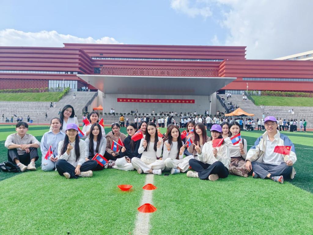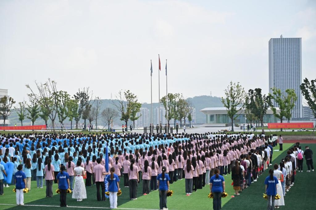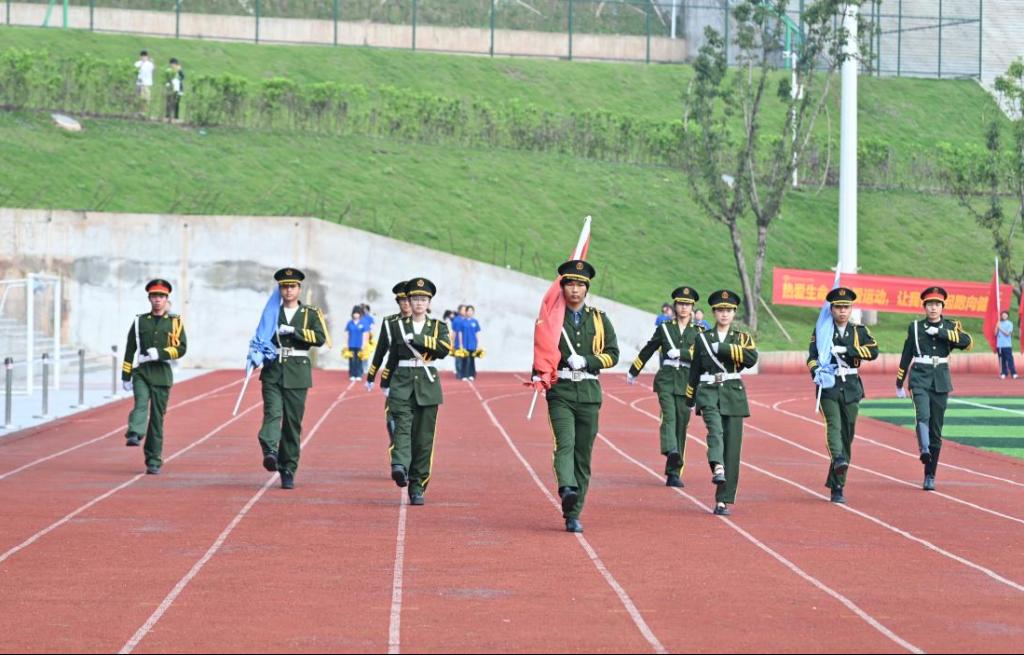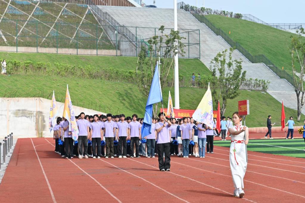 升旗仪式庄严举行,五星红旗与校旗迎风飘扬,国歌声、校歌声回荡在赛场上空,爱国爱校之情深深浸润每一颗心灵。