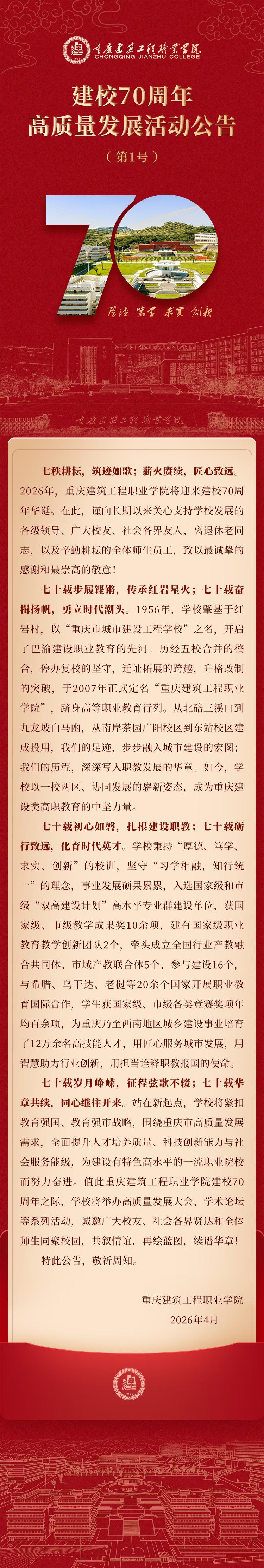 重庆建筑工程职业学院建校70周年高质量发展活动公告(第1号)