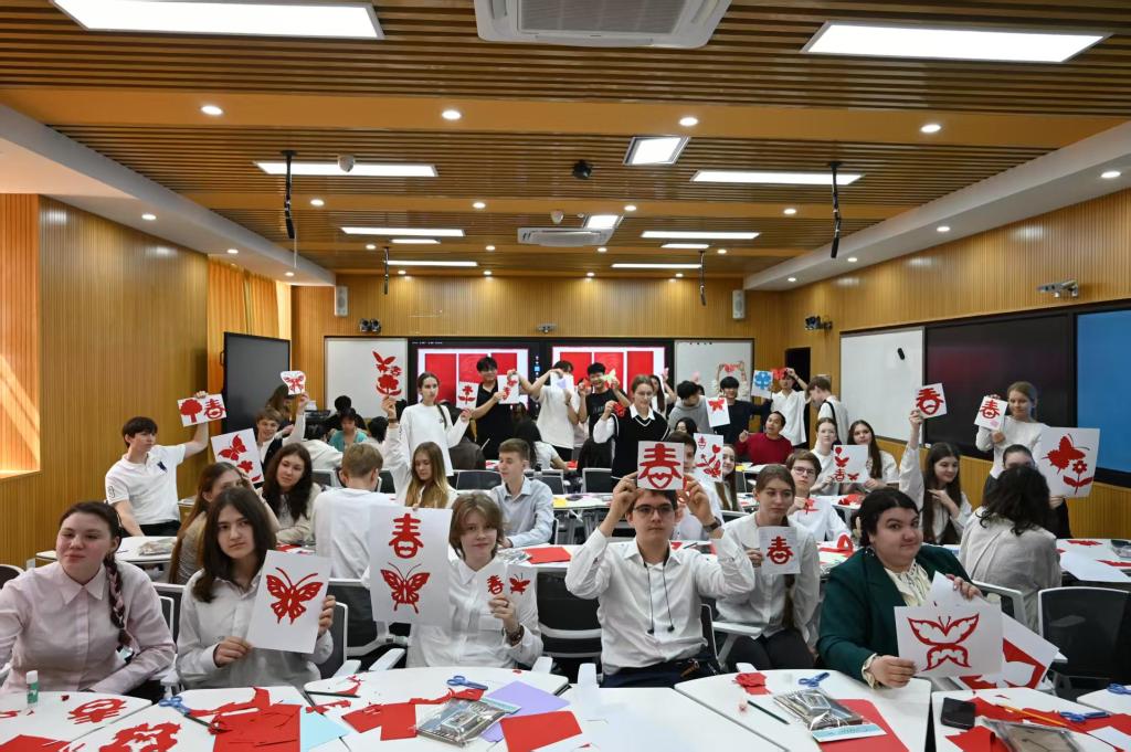 在学校教师带领下,俄罗斯师生沉浸式体验了中国剪纸非遗文化。在观看剪纸传统历史与技艺讲解演示后,大家纷纷动手实践,通过对折、剪刻、粘贴等步骤完成剪纸作品,真切感受中华传统非遗文化的乐趣与深厚底蕴。