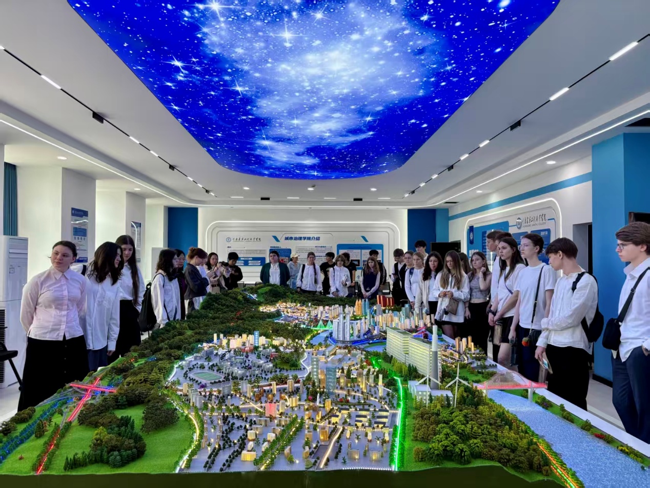 最后,莫斯科公立英才学校师生前往学校实训基地观摩学习,亲身体验建筑沙盘操作、智慧停车、智慧消防等数字化管理场景,系统了解智能建造、智慧交通、城市治理等全生命周期智慧化应用,近距离体验重庆职业教育数字化实训的前沿发展成果。