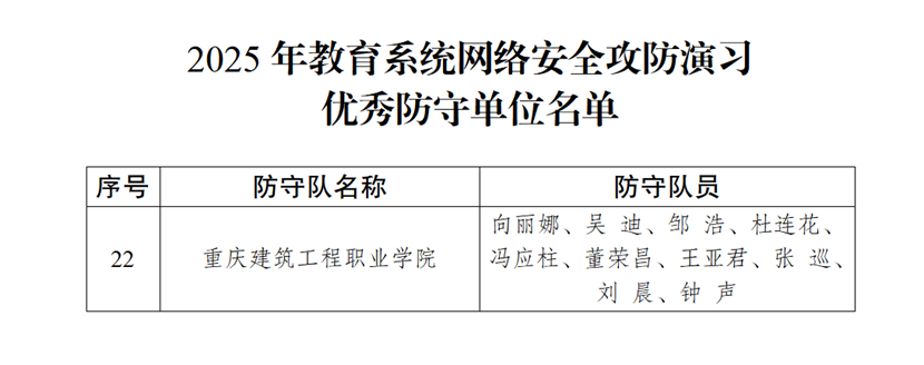 近日,重庆市教育委员会下发《关于2025年教育系统网络安全攻防演习结果的通报》(渝教科函〔2025〕38号),我校获评“优秀防守单位”。本次演习共有28支攻击队伍、107支防守队伍参与,历时5天,共评选出优秀攻击队伍14支、优秀防守单位26支、优秀组织单位1个。