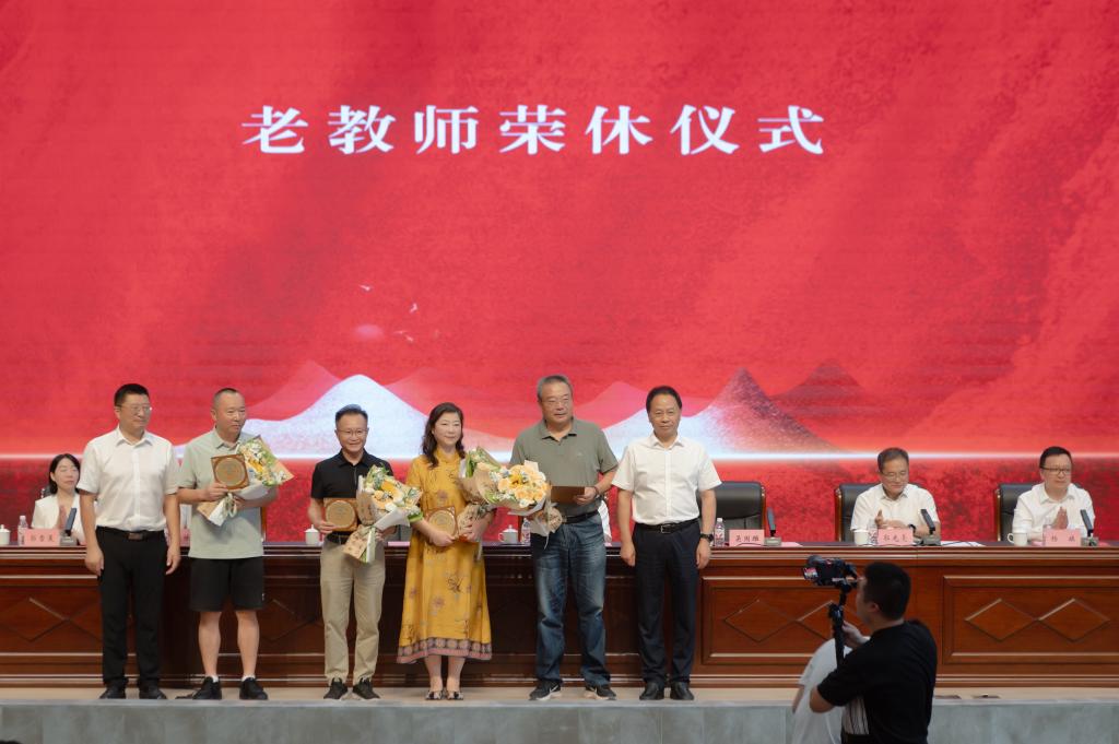 大会特别设置了致敬环节。主席台领导为伍朝阳、李莎、霍浩等12名从教三十周年教师代表颁发纪念章,新教师向他们献花致敬。荣休仪式上,校领导为罗雪、王廷杰、余斌、潘俊峰等教师颁发“荣休纪念章”并献上鲜花,感谢他们多年来为学校发展作出的贡献,全场以热烈的掌声,向荣休教师表达崇高的敬意和美好的祝愿。