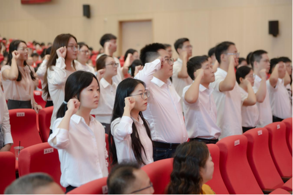 新任教师宣誓仪式庄严举行,32名教师在副校长杨旗带领下宣誓入职,为师资队伍注入新活力。