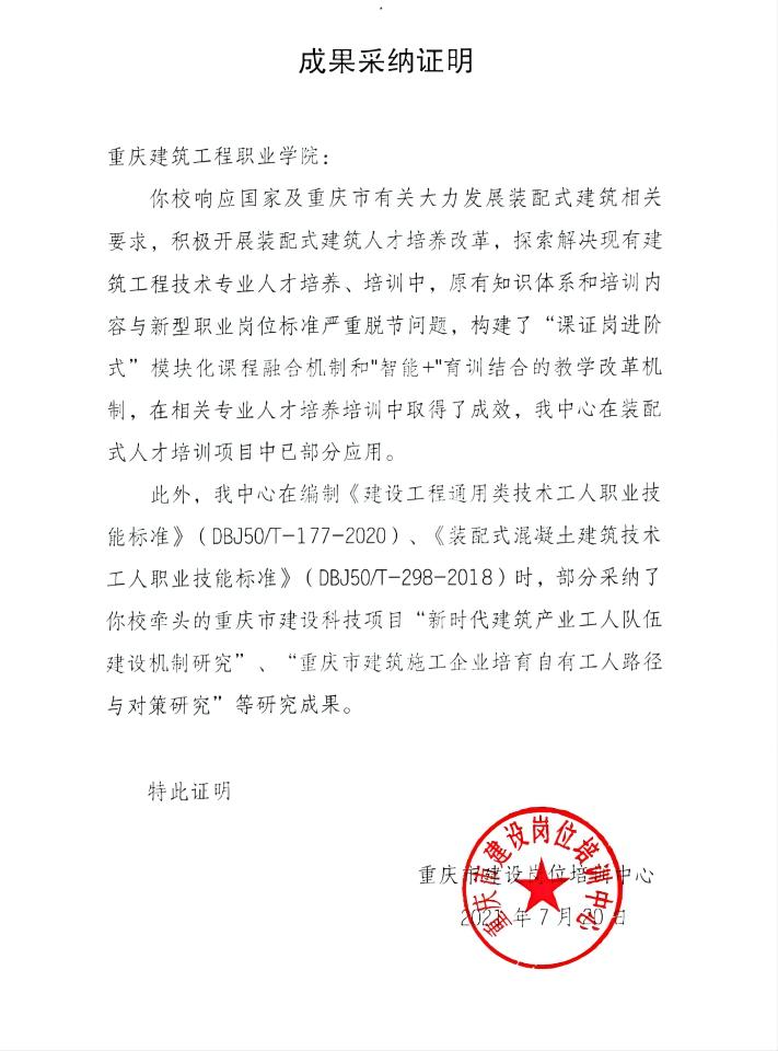 重庆市建设岗位培训中心在编制《建设工程通用类技术工人职业技能标准》等标准编制中运用学校相关成果