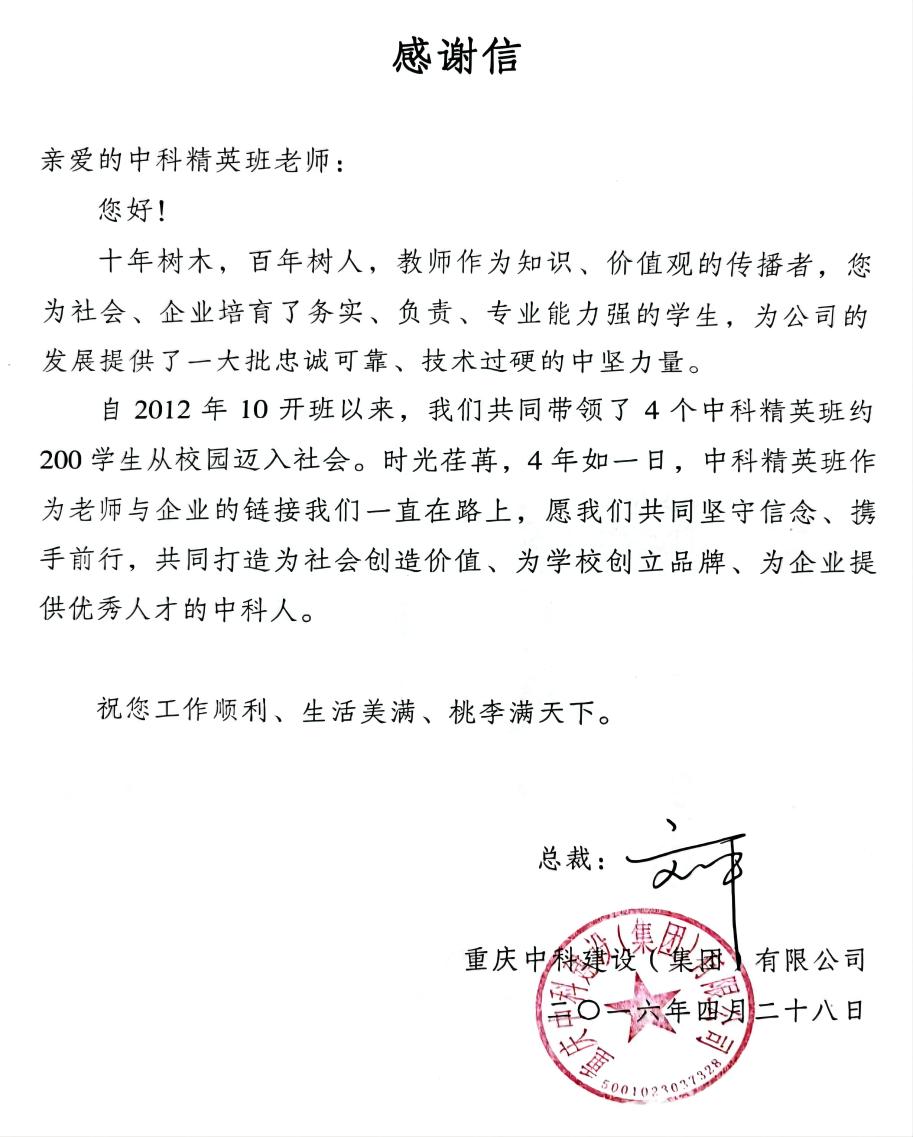 重庆中科建设(集团)有限公司感谢学校“订单班”人才培养成效