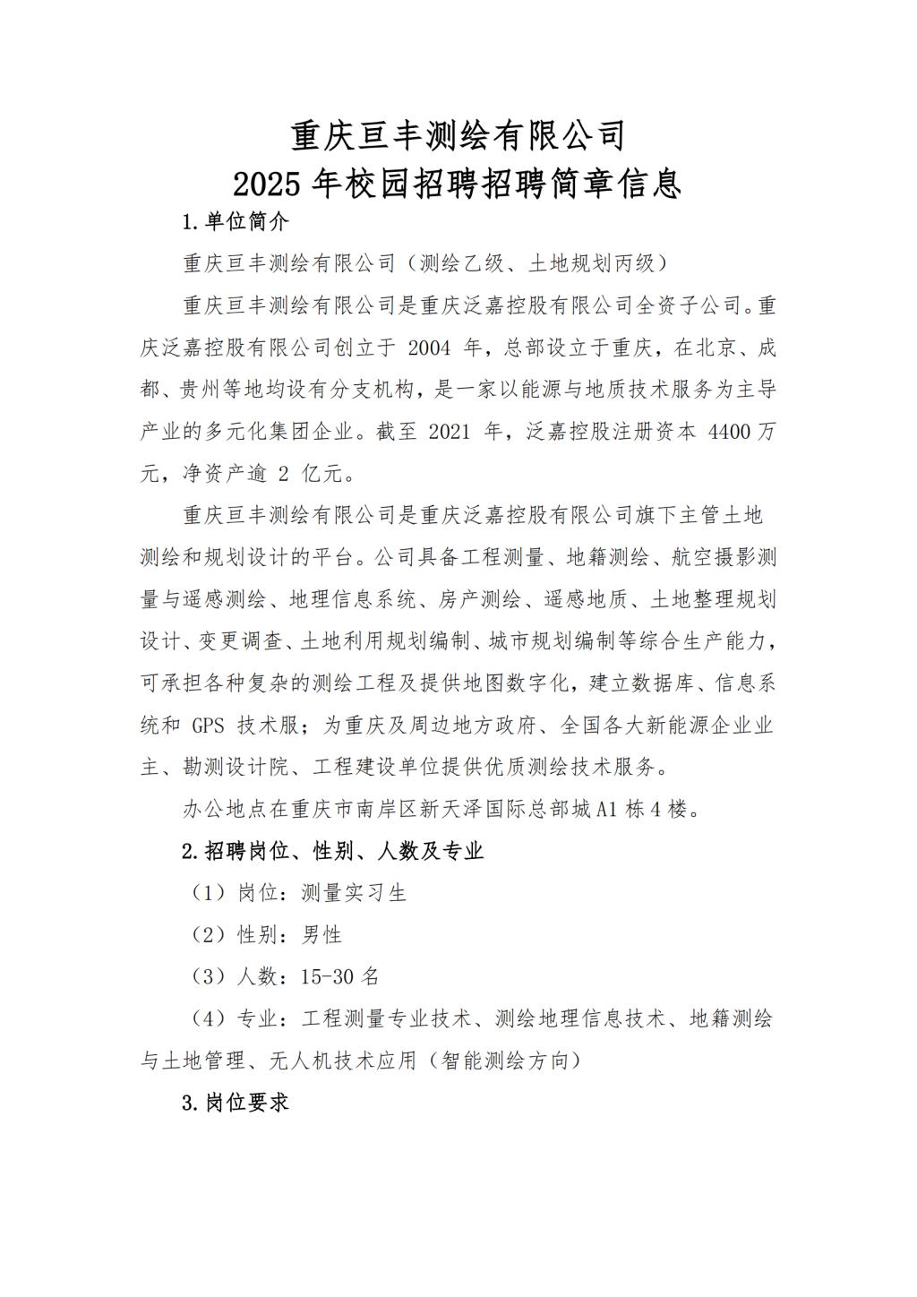 重庆亘丰测绘有限公司2025年校园招聘招聘简章信息