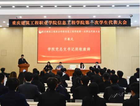 阔步新征程,谱写新篇章。为进一步加强学生管理,完善学生管理制度和维护学生权益,推动院学生会工作高质量发展,11月14日,信息工程学院第一次学生代表大会在学校思政厅顺利召开。信息工程学院党总支书记、院长别牧、党总支副书记李雪、办公室主任王毅、学工办副主任胡君、团总支书记刘晨,学院全体辅导员及来自设计学院、经管学院等兄弟学院6名学生会代表,全院72名学生代表参加开幕会。
