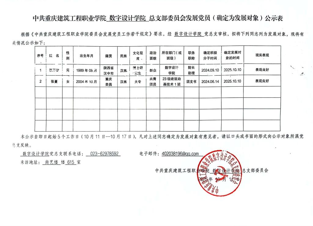 中共重庆建筑工程职业学院数字设计学院总支部委员会发展党员(确定为发展对象)公示