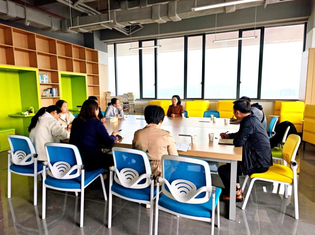 参观结束后,双方在图书馆2楼阅览区召开座谈会,会议由张春伟副馆长主持。会上,我校综合办公室和信息技术部负责人分别对新馆的规划、空间功能、数字设施设备采购等方面进行详细说明。廖彩霞馆长简要介绍重庆商务职业学院新馆项目背景,并针对前期设计方案、功能需求清单、智慧服务场景等与我馆深入交换意见,现场讨论气氛热烈、务实高效。