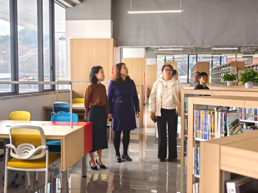 考察组先后走访各楼层阅览区、研讨间、分享区等,重点围绕图书馆规划建设、功能布局、学习空间打造及智慧化建设四大维度,进行现场沟通,直观了解场馆建设细节与运行情况。