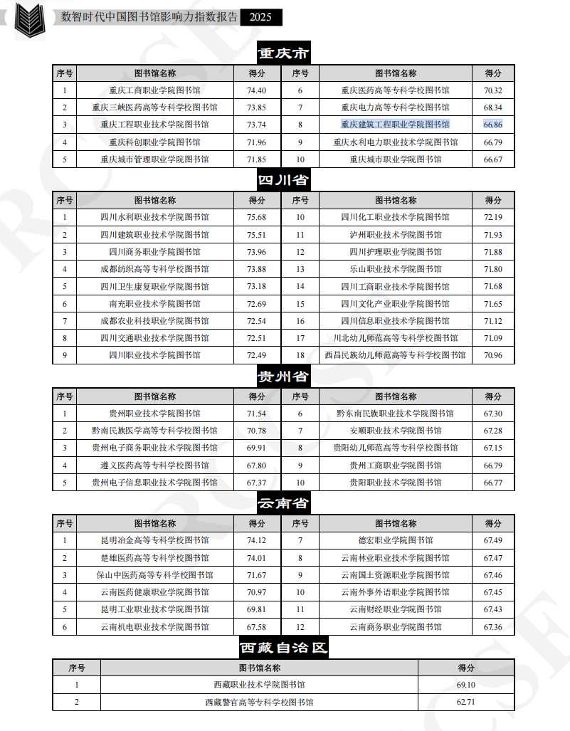 其中,我校图书馆凭借综合实力位列重庆市高职高专院校第8位,彰显了学校在文献资源建设、智慧服务与育人实践方面的突出成效。