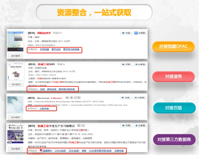 超星发现通过整合本馆纸本资源和电子资源,同时整合资源获取的路径,达到一条数据同时可看到馆藏资源路径和电子资源路径,完成纸电资源的统一检索。强大的统一检索功能,帮助你在海量的学术资源中,快速找到与自己研究相关的资料