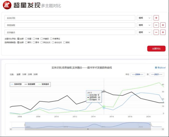 当我们对多个研究方向难以抉择时,超星发现的多主题对比模块,可以对课题进行多方位对比,从单位、作者、标题内容、年份等方面,让同学们更加直观地了解课题的发展趋势,提供准确、全面的数据支持。让同学们更加全面、彻底地了解课题背景!从而确定具体的研究方向。多主题对比分析可同时支持5个主题的趋势对比分析。