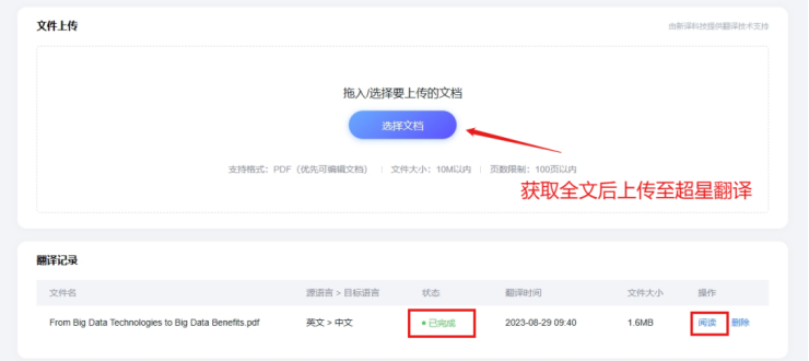 点击右上角工具栏中"超星翻译”进入界面,选择或拖入待翻译文档后,点击“立即翻译”,即可在线翻译文献资料。与此同时,翻译记录将会保存在导入界面的翻译记录中,下次登录,点击翻译记录即可查看历史阅读文章。