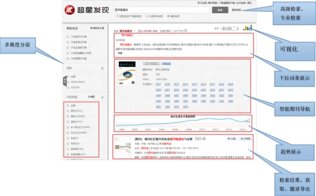 超星发现还具备全文检索能力,对接学校图书资源后,用户可以在进行图书检索时命中图书目次,还可以进行图书章节检索,并且可以通过点击当前章节迅速定位到该章节所在的图书页。此外,超星发现还引入了期刊内容全文检索和图片检索功能。