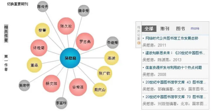(3)作者关联图:可以查看作者与作者直间关联、领域与作者直间关联、机构与作者之间关联等。点击其他作者名字可以进入到该作者关系图中,可以查看与上一位作者或者查询词直接的关联等。
