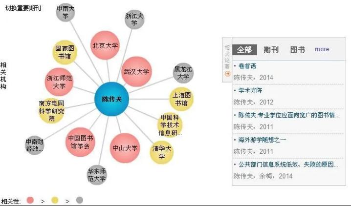 (4)机构关联图:可以展示机构与机构关联、作者与机构关联、领域与机构关联等,右侧展示相关论著。点击某机构可以进入该机构的关系图中。