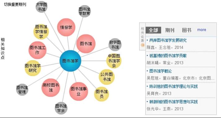 (2)知识点关联图:查询词所关联的学科与领域,查询词可以是作者、领域、学科、机构、词语。右侧展示相关的论著。点击某领域则会进入该领域的关联中。更好的展示知识与知识直接关联。