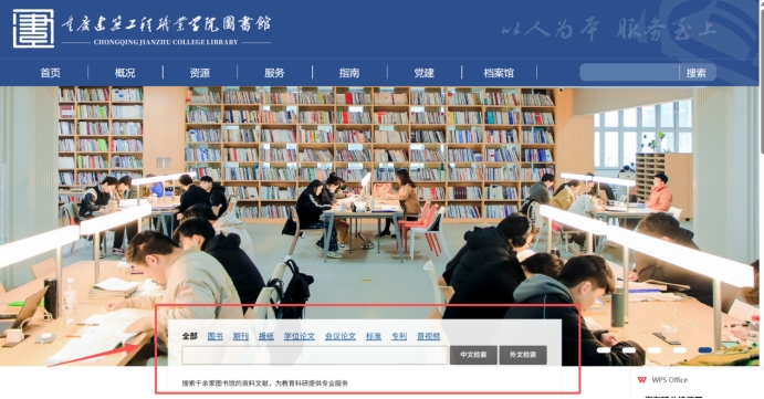 2、访问“重庆建筑工程职业学院图书馆”门户网站,点击发现搜索框。