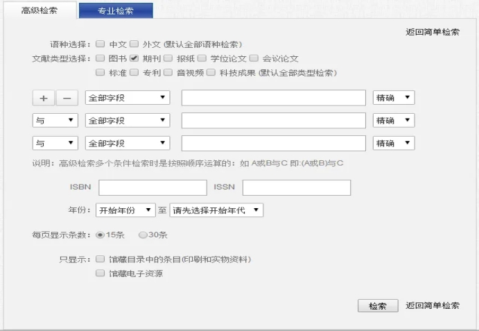 超星发现左侧提供包含语言、关键词、作者等11个分面聚类,且支持多维复选,有效实现检准;同时基于专业词表帮助用户实现智能检索;还提供空检索、简单检索、高级检索和专业检索四种检索方式,满足用户不同深度的检索需求。此外,还提供保存式检索,大大节省了检索时间。
