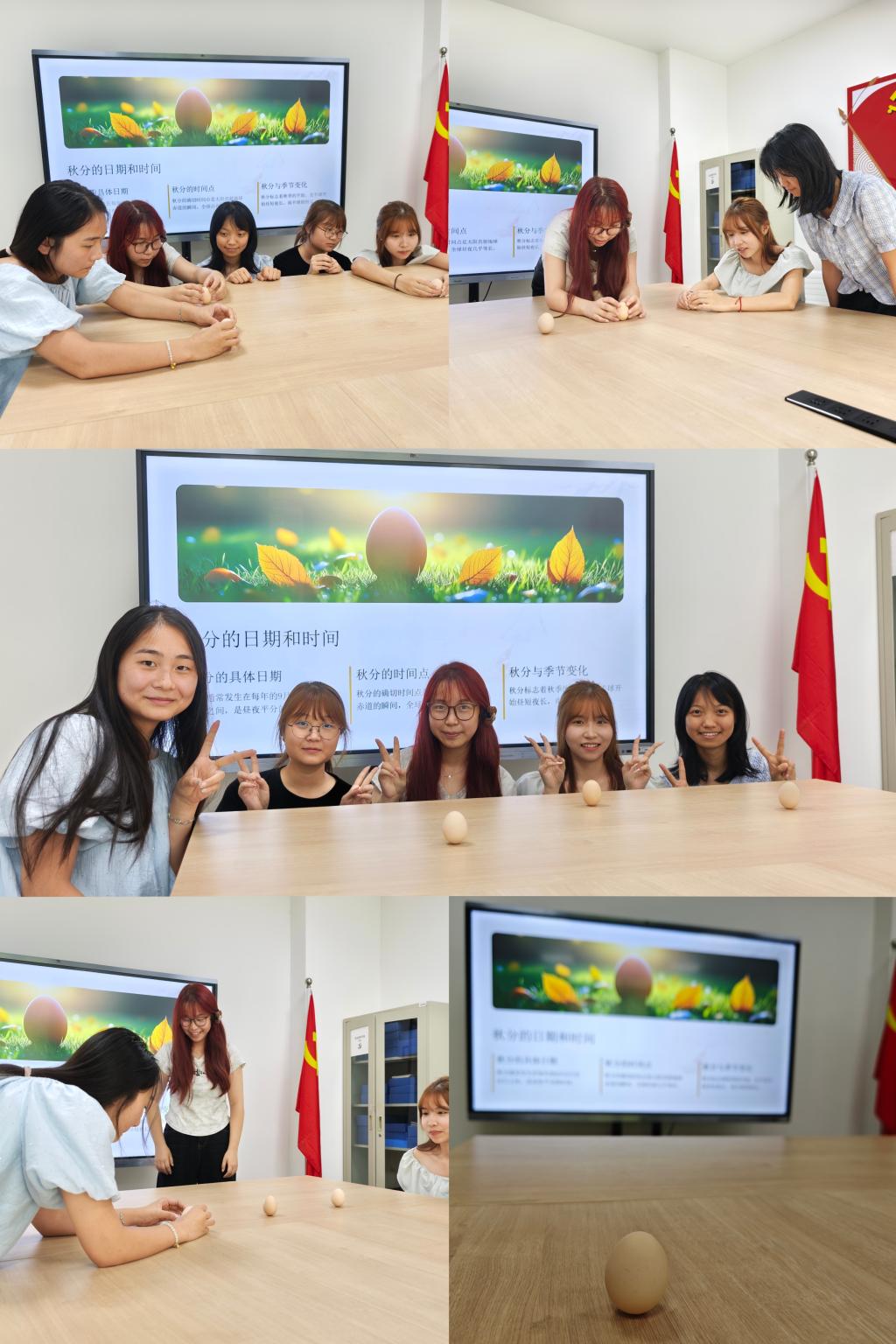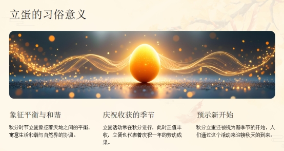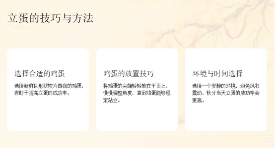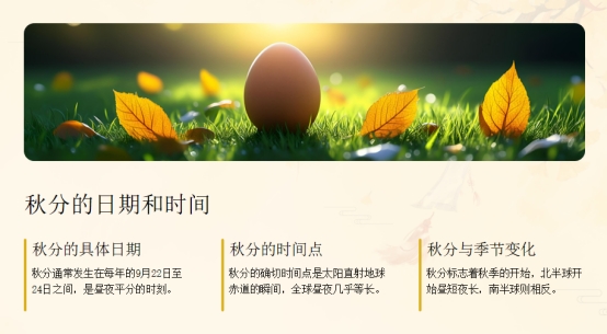 “秋分到,蛋儿俏”。在每年的春分或秋分这一天,我国很多地方都会有数以千万计的人在做“竖蛋”试验。选择一个“身量匀称”的新鲜鸡蛋,轻手轻脚地竖放在桌上。在古老的传说中,秋分这天最容易把鸡蛋立起来。据史料记载,秋分立蛋的传统起源于4000年前的中国,以庆祝秋天的来临。竖蛋活动寄寓了人们对生命、生育的敬畏和崇敬之情。