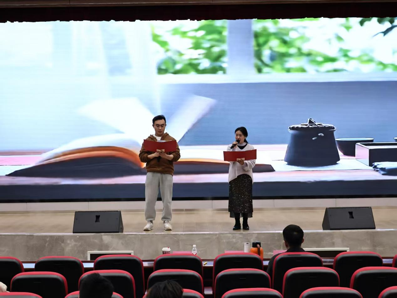 赛场之上,选手们各展所长,整场活动精彩纷呈。参赛选手展示完毕后,图书馆刘丽老师作为评委代表从语言表达、舞台表现等维度进行了专业点评并与党政办的郑乃仁老师为同学们深情朗诵了诗歌《四月的纪念》。