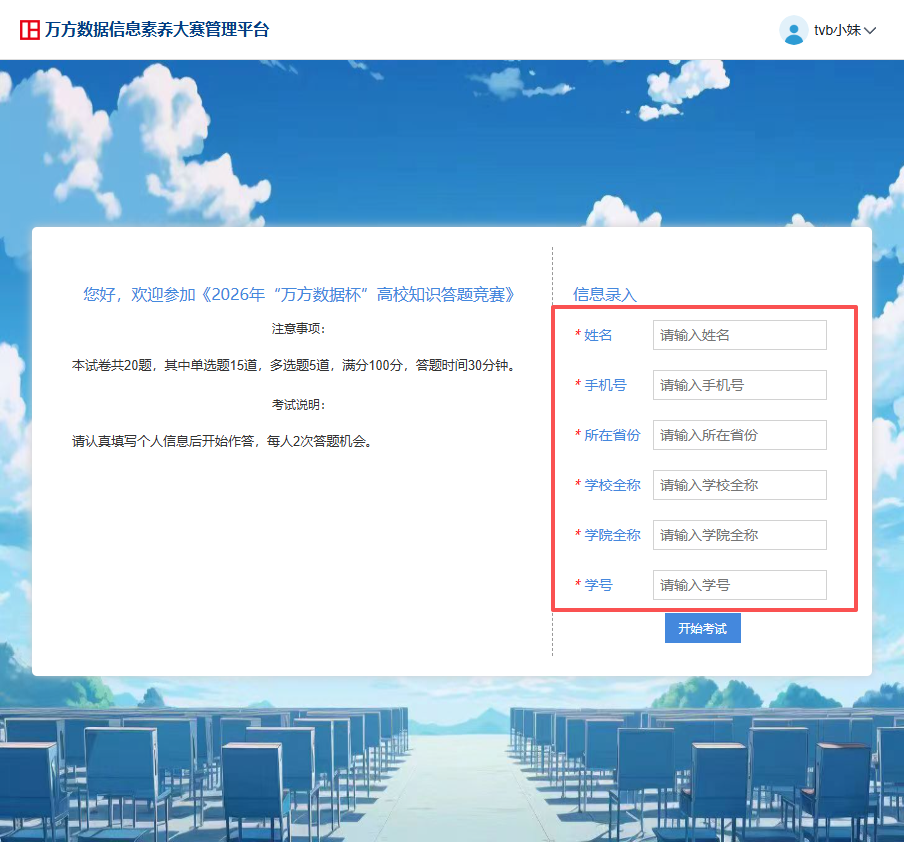 (3)进入答题系统,填写姓名、手机号、所在省份(重庆)、学校全称(输入学校全称)、学院全称、学号等个人信息后在相应的时间段内即可开始答题。(注意:个人信息需确保准备无误,否则无法导出,视为无效成绩。)