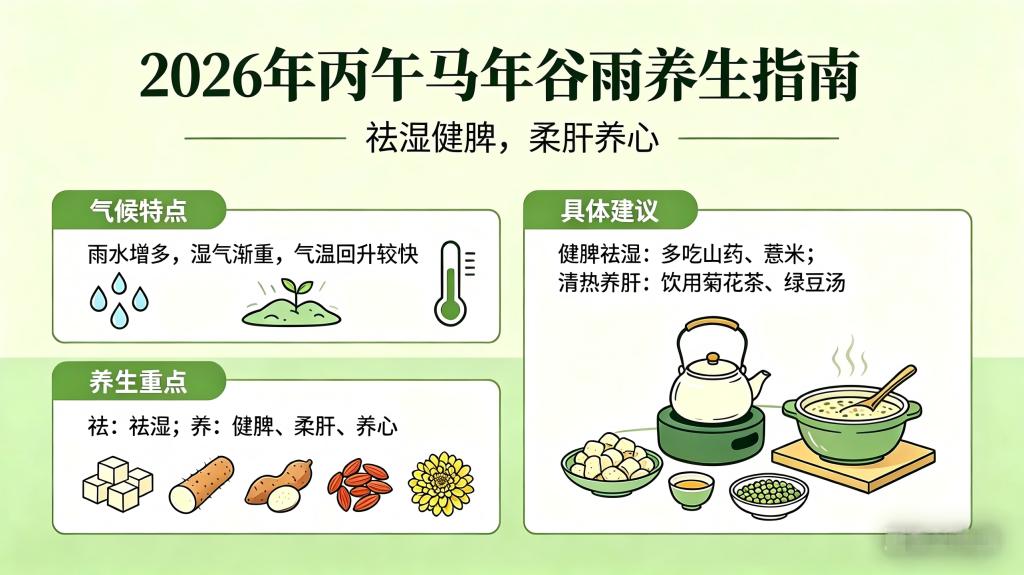 丙午马年谷雨,养生重在“祛”与“养”。此时雨水增多,湿气渐重,气温回升较快,养生当以健脾祛湿、清热养肝为要。