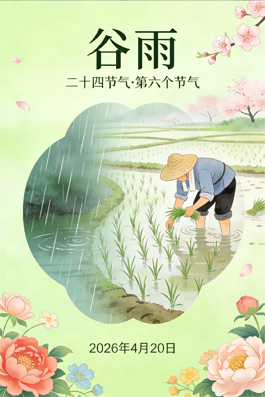 今天是2026年4月20日,我们迎来了二十四节气中的第六个节气——谷雨。这是一个充满水汽与生机的名字。此时,太阳黄经达30°,雨量充沛,百谷萌发,正是“雨生百谷”的生动写照。作为春季的最后一个节气,谷雨承载着农耕文明的智慧,也寄寓着对丰收的期盼,此时节,柳絮飞落,杜鹃夜啼,牡丹吐蕊,樱桃红熟。在暮春的微风细雨中,感受春末夏初的生机与希望。让我们抓住春天的尾巴,向这个生机勃勃的季节做一场深情的告别。