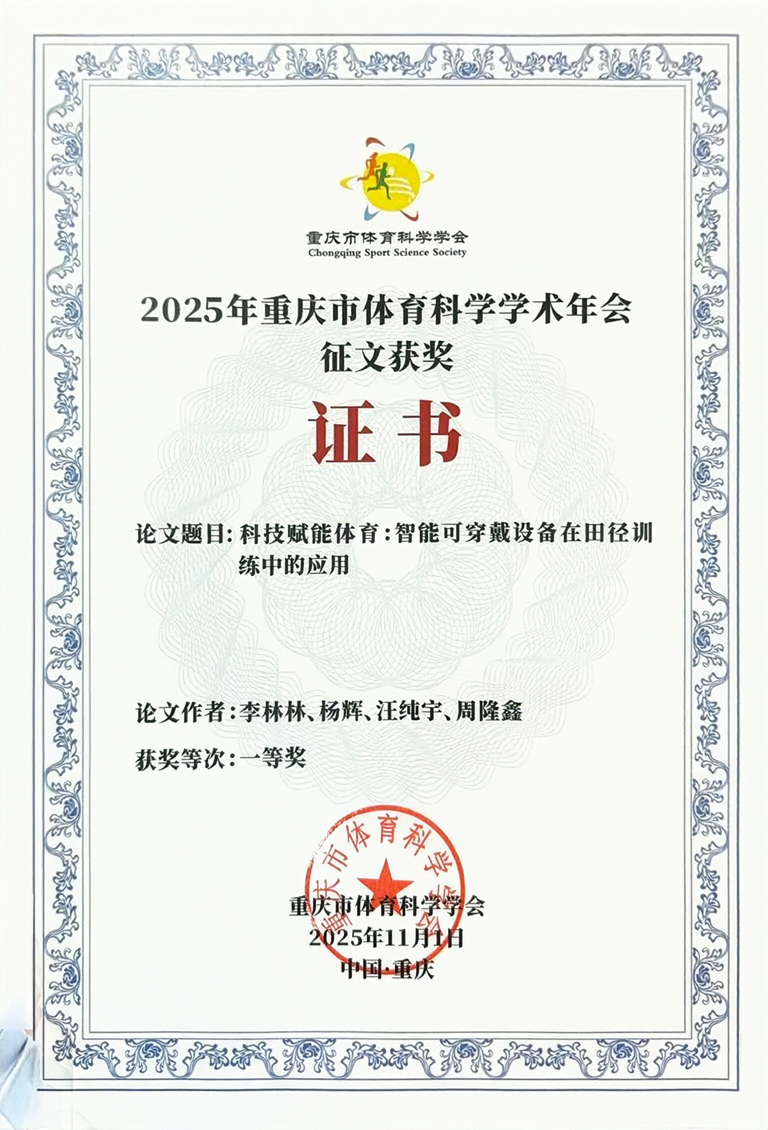 近日,重庆市体育科学研究所公布了2025年重庆市体育科学学术年会征文获奖结果的通知,我院军体教研室体育教师李林林、汤宪美等人提交的《科技赋能体育智能可穿戴设备在田径训练中的应用》与《新质生产力促进重庆市体育产业高质量发展的驱动路径》分别获得一等奖与二等奖,此次征文活动充分展现了我校体育教师刻苦钻研的学习态度与良好的科研水平。